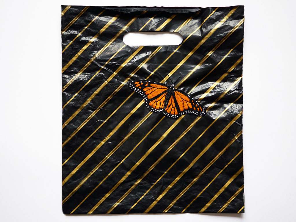Le Monarque – Danaus plexippus – est un papillon qui migre du Québec jusqu’au Mexique. Sa survie dépend de l’équilibre climatique. Cette espèce est menacée à cause de la déforestation et de l’utilisation du glysophate dans ces pays. Sa disparition provoquerait celle de cent autres espèces par réaction en chaine. On suppose qu’il parcoure ces 4000 km grâce au mouvement du soleil mais on ne connait pas l’origine de sa migration. Il arrive d’en retrouver perdus au dessus de l’océan. Ici, il s’est aussi perdu, brodé sur un sac plastique.