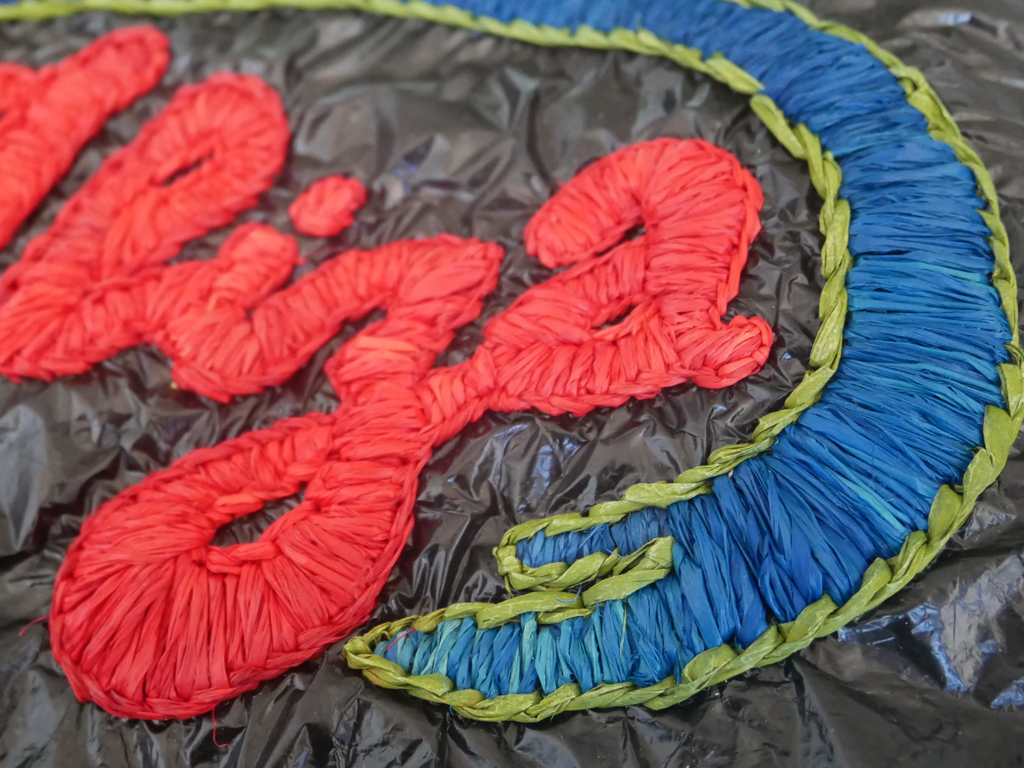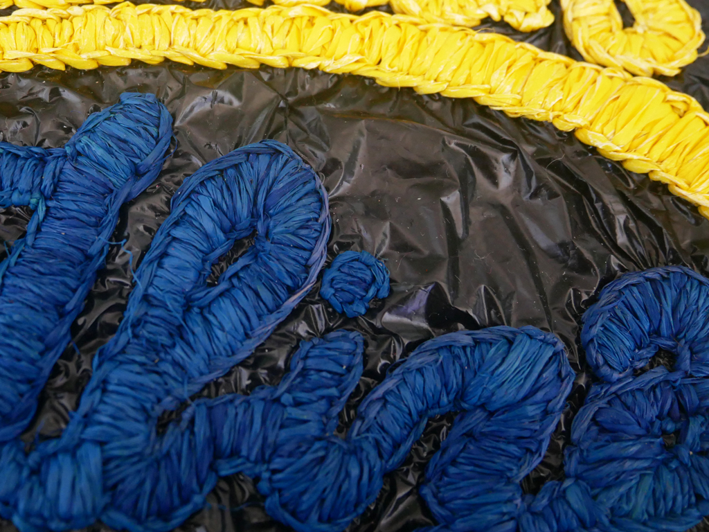 Prototypes de broderies en raffia sur sacs plastiques crochetés en collaboration avec Facteur Céleste pour la marque Loewe